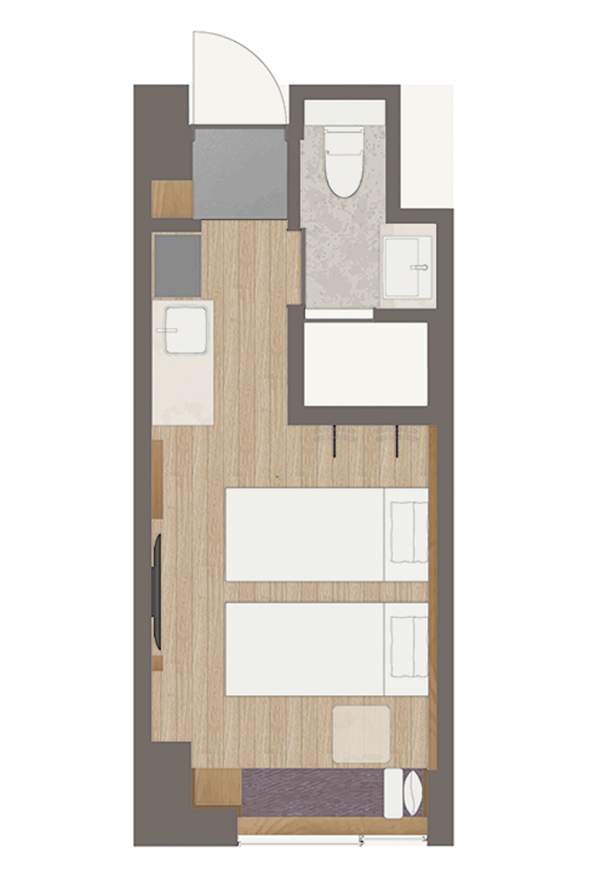 | Room features | Kitchenette(no stove), Shower, Wash basin, Individual air conditioning, Wi-Fi, Washlet bidet toilet, Nihon Bed(luxury hotel bed brand), Microwave, Fridge-freezer, Electric kettle, Phone, Safety box, 50-inch LCD Smart TV, Air purifier with humidifier |